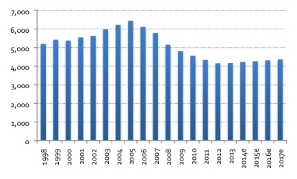 Spend per adult on interactive gaming is still expected to increase from low double digits to high double digits over the coming fiver years. However, due to structural changes in a number of products, total gambling spend per adult is expected to fall from US$313 in 2013 to US$216 by 2018e. NB. H2’s spend per adult calculations account for a proportion of casino revenue being generated from non-state residents (other permutations are available in the detailed dataset model).